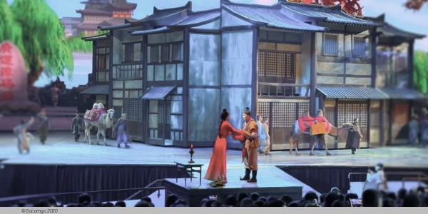 "The Legend of Camel Bell" is shown in Xi 'an Huaxia Cultural Tourism Grand Theater. It is designed as a large ellipsoid building 142 meters long, 128 meters wide and about 50 meters high, which can accommodate 3,000 people to watch performances at the same time.